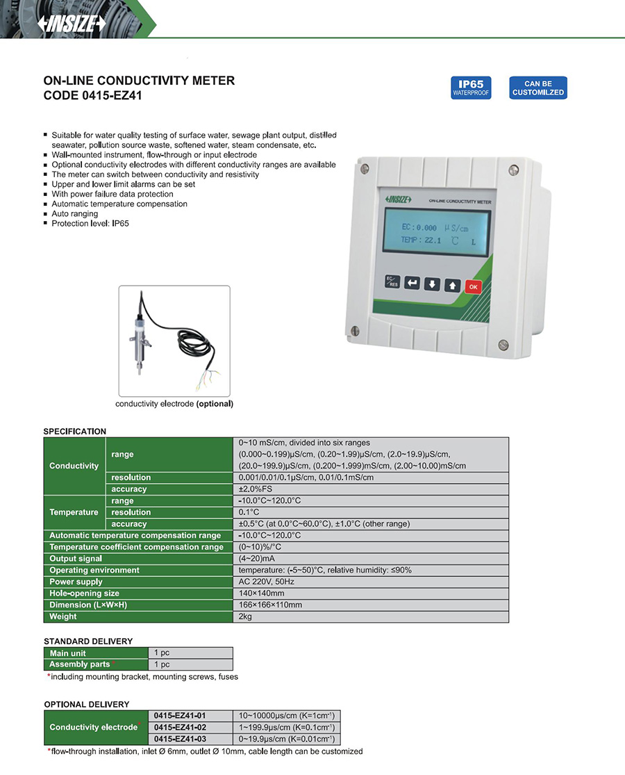 0415-EZ41 conductivity/TDS on-line 0~10mS/cm, divided into six ranges (0.000~0.199)μS/cm, (0.20~1.99)μS/cm, (2.0~19.9)μS/cm, (20.0~199.9)μS/cm, (0.200~1.999)mS/cm, (2.00~10.00)mS/cm, -10.0°C~120.0°C yes