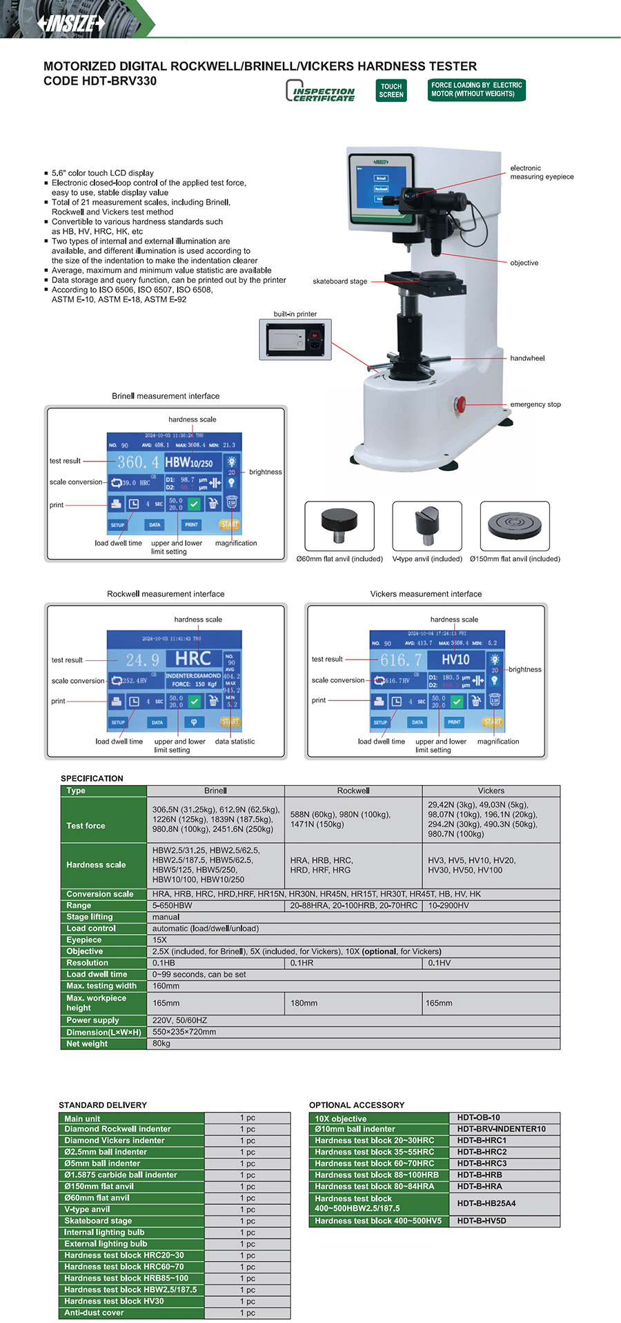 | HDT-BRV330 | Vickers | automatic (load/dwell/unload) | 165mm | 160mm | HV3, HV5, HV10, HV20, HV30, HV50, HV100 |