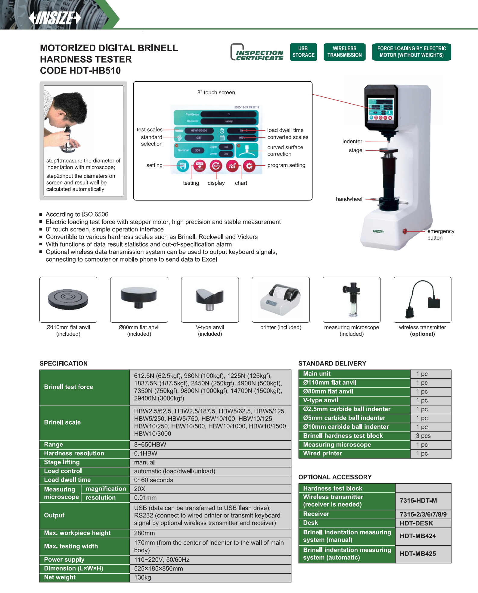 HDT-HB510 62.5kgf, 100kgf, 125kgf, 187.5kgf, 250kgf, 500kgf, 750kgf, 1000kgf, 1500kgf, 3000kgf automatic (load/dwell/unload) 280mm 170mm (from the center of indenter to the wall of main body) HBW2.5/62.5, HBW2.5/187.5, HBW5/62.5, HBW5/125, HBW5/250, HBW5/750, HBW10/100, HBW10/125, HBW10/250, HBW10/500, HBW10/1000, HBW10/1500, HBW10/3000