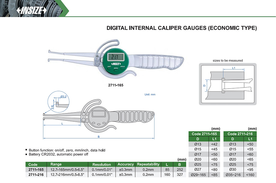 | 2711-216 | 12.7-216mm/0.5-8.5" | ±0.3mm | 0.1mm/0.01" |
