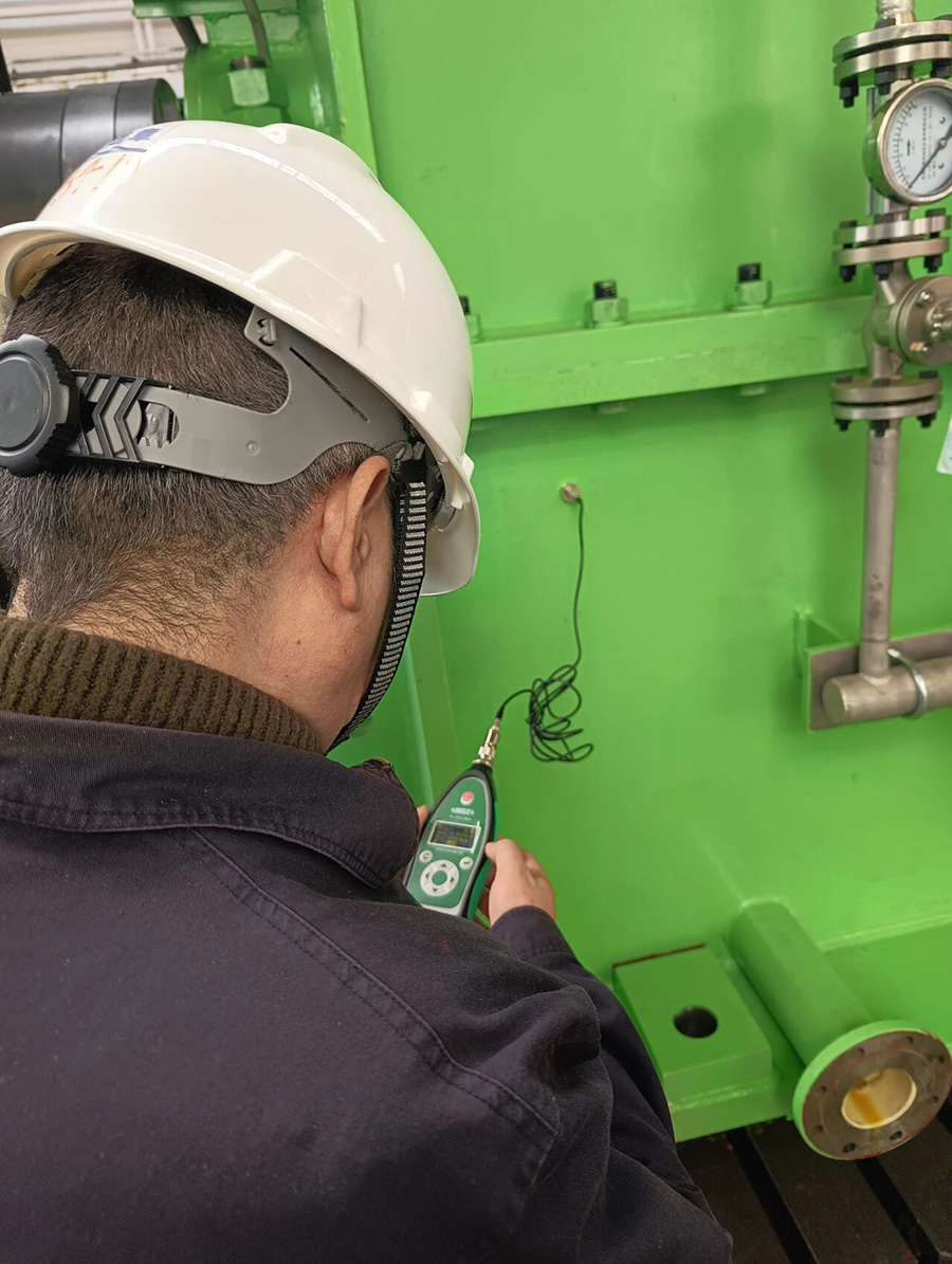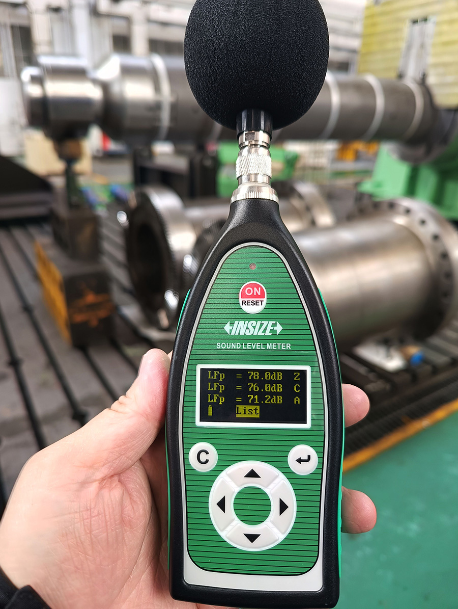 During final inspection, engineers use the INSIZE 0011-FA25 Integrating Sound Level Meter to measure operating noise at different distances and angles.