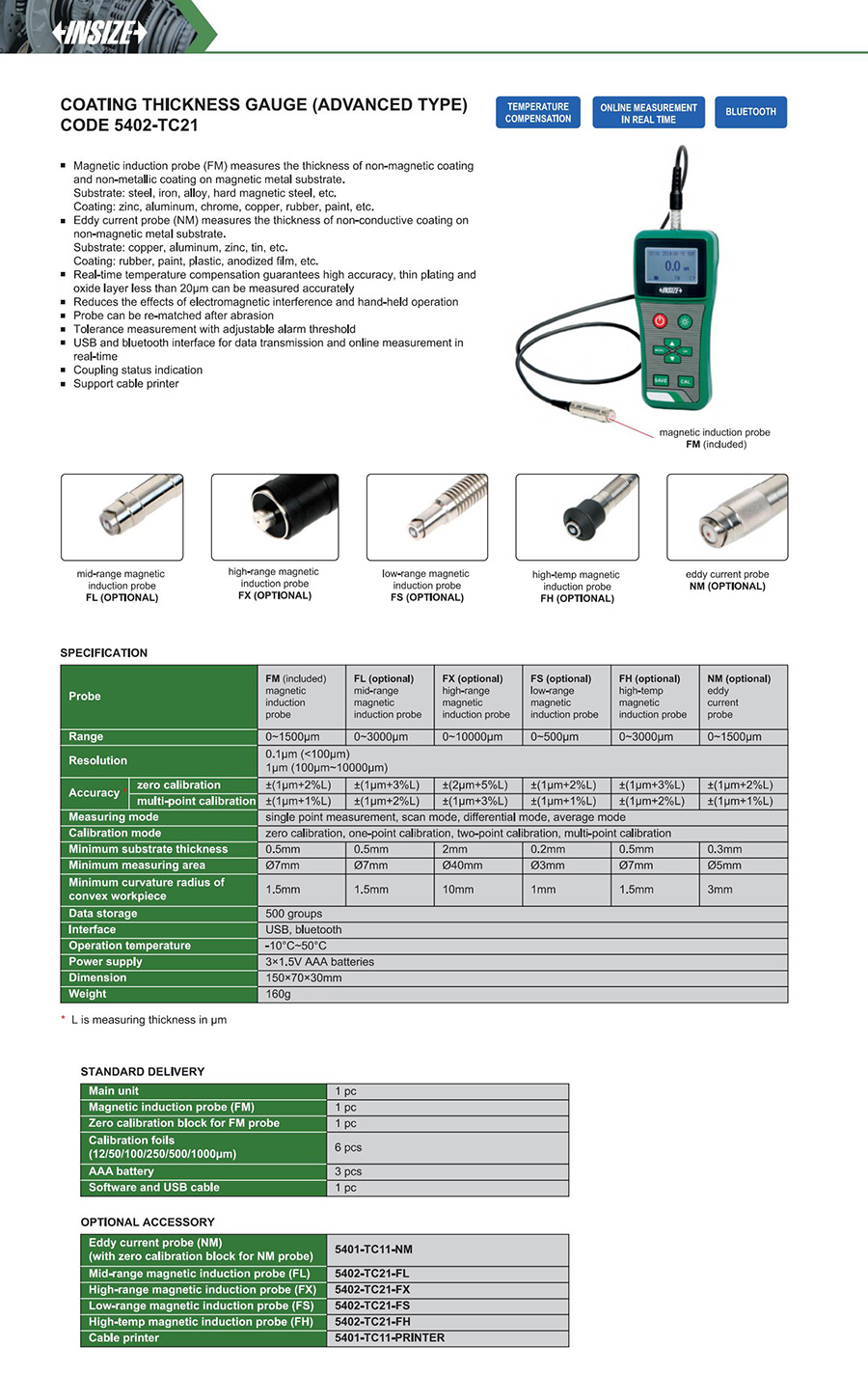 5402-TC21 0~1500μm: FM (included) magnetic induction probe multi-point calibration ±(1μm+1%L) 0.1μm (<100μm), 1μm (100μm~1500μm) USB, bluetooth