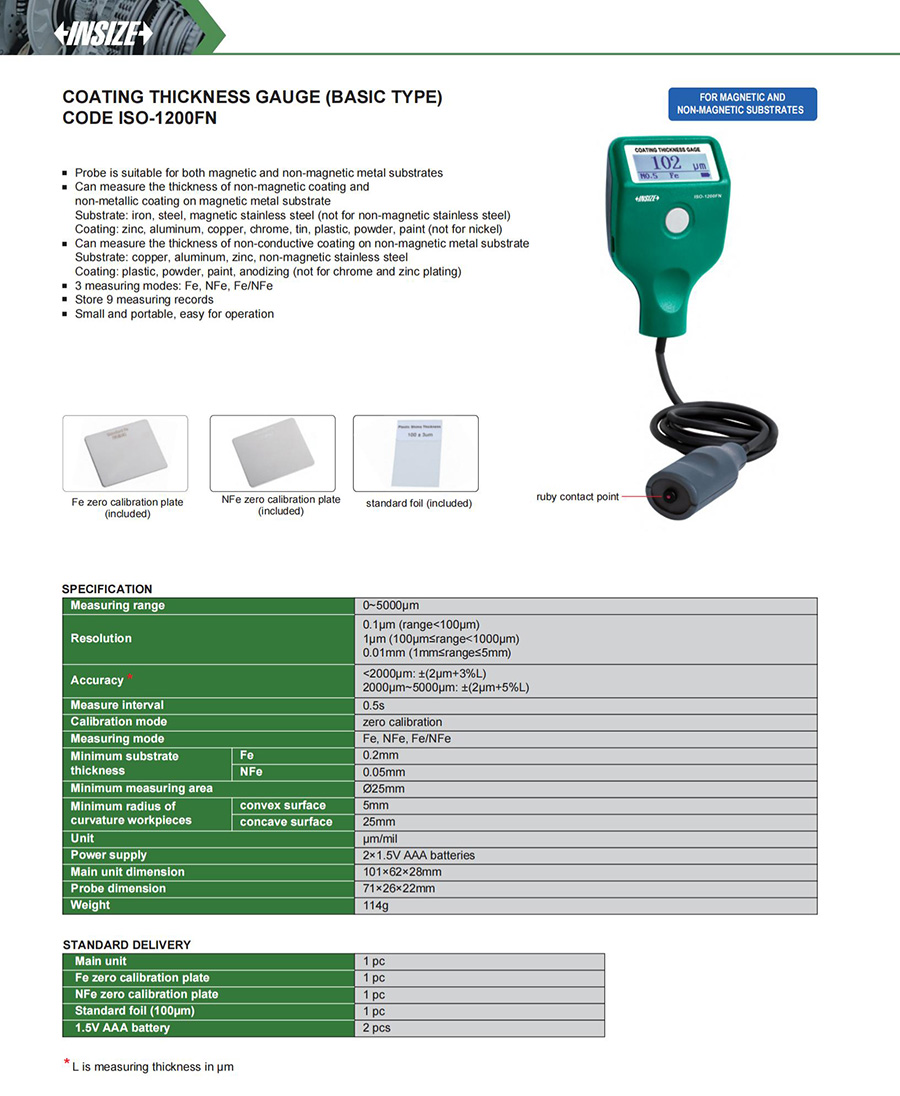 ISO-1200FN 0~5000μm <2000μm: ±(2μm+3%L), 2000μm~5000μm: ±(2μm+5%L) 0.1μm (range<100μm), 1μm (100μm≤range<1000μm), 0.01mm (1mm≤range≤5mm) no