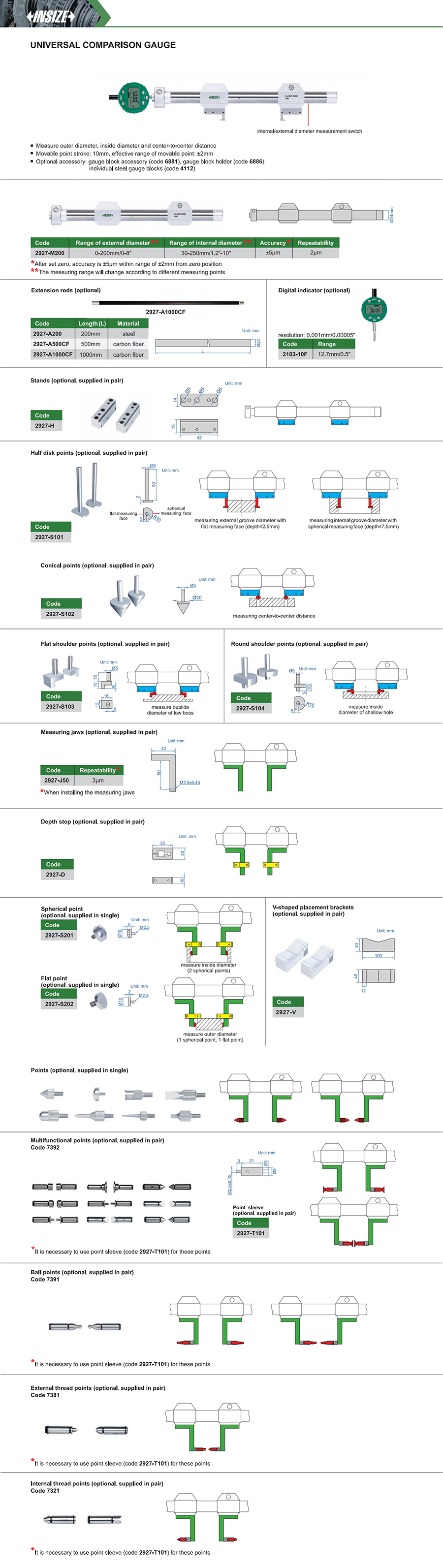 | 2927-M200 | ±5µm | 2µm | 0-200mm/0-8" | 30-250mm/1.2"-10" |