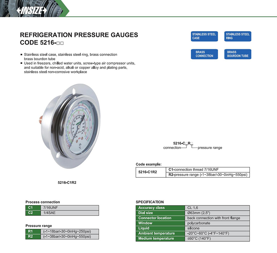Stainless steel case, stainless steel ring, brass connection, brass bourdon tube