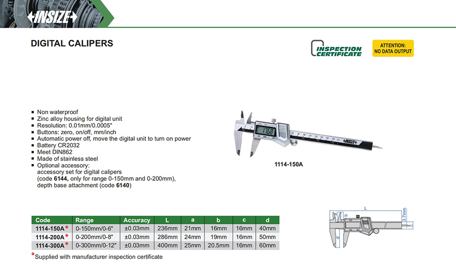 1114-150A 0-150mm/0-6" ±0.03mm 0.01mm/0.0005" without data interface