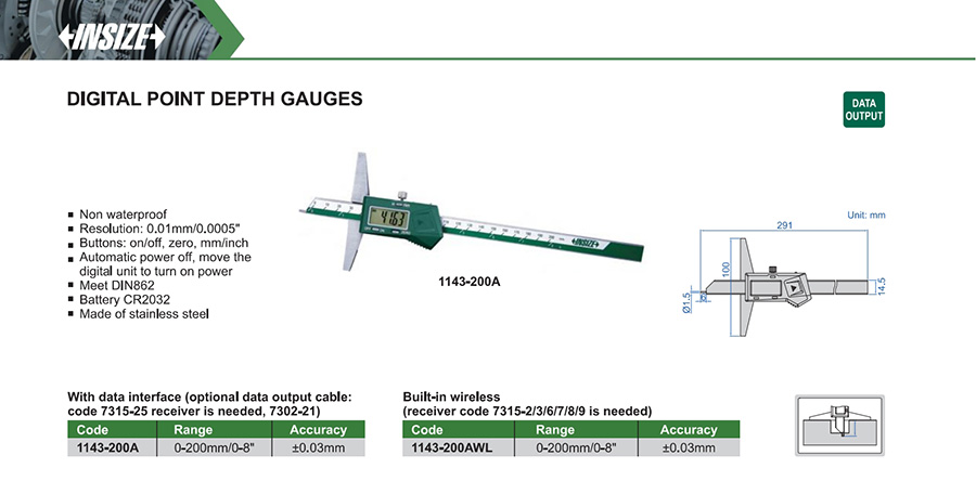 | 1143-200A | 0-200mm/0-8" | ±0.03mm | 0.01mm/0.0005" | with data interface |