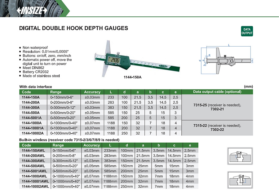 | 1144-150A | 0-150mm/0-6" | ±0.03mm | 0.01mm/0.0005" | with data interface |
