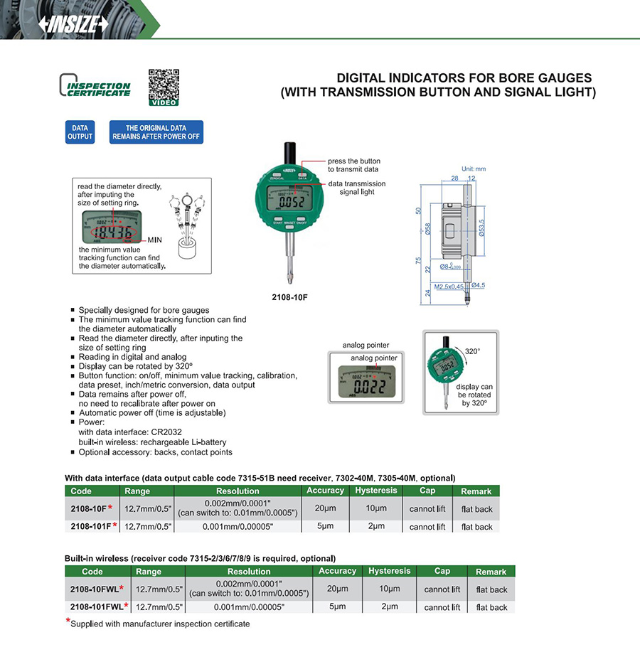 | 2108-101F | 12.7mm/0.5" | 5µm | 0.001mm/0.00005" |