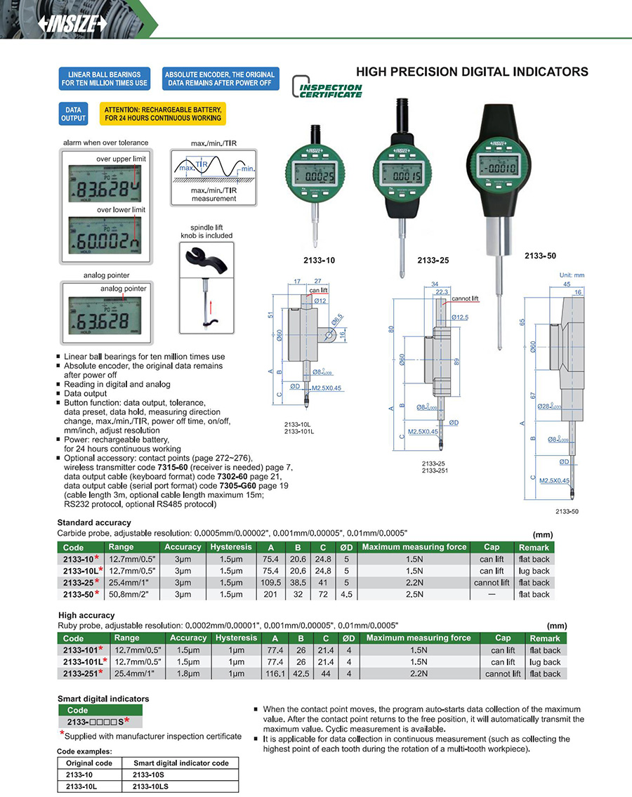 | 2133-251 | 25.4mm/1" | 1.8µm | 0.0002mm/0.00001" |