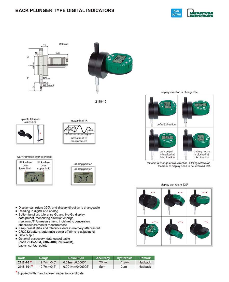 Button function: tolerance Go and No-Go display, data preset, measuring direction change, max./min./TIR measurement, inch/metric conversion,absolute/incremental measurement