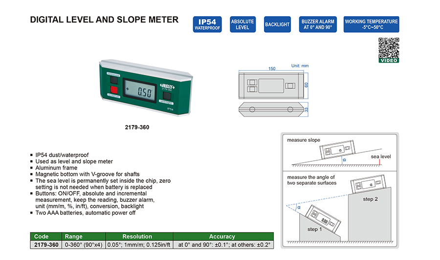 2179-360 0-360° (90°×4) at 0° and 90°: ±0.1°; at others: ±0.2° 0.05°; 1mm/m; 0.125in/ft no