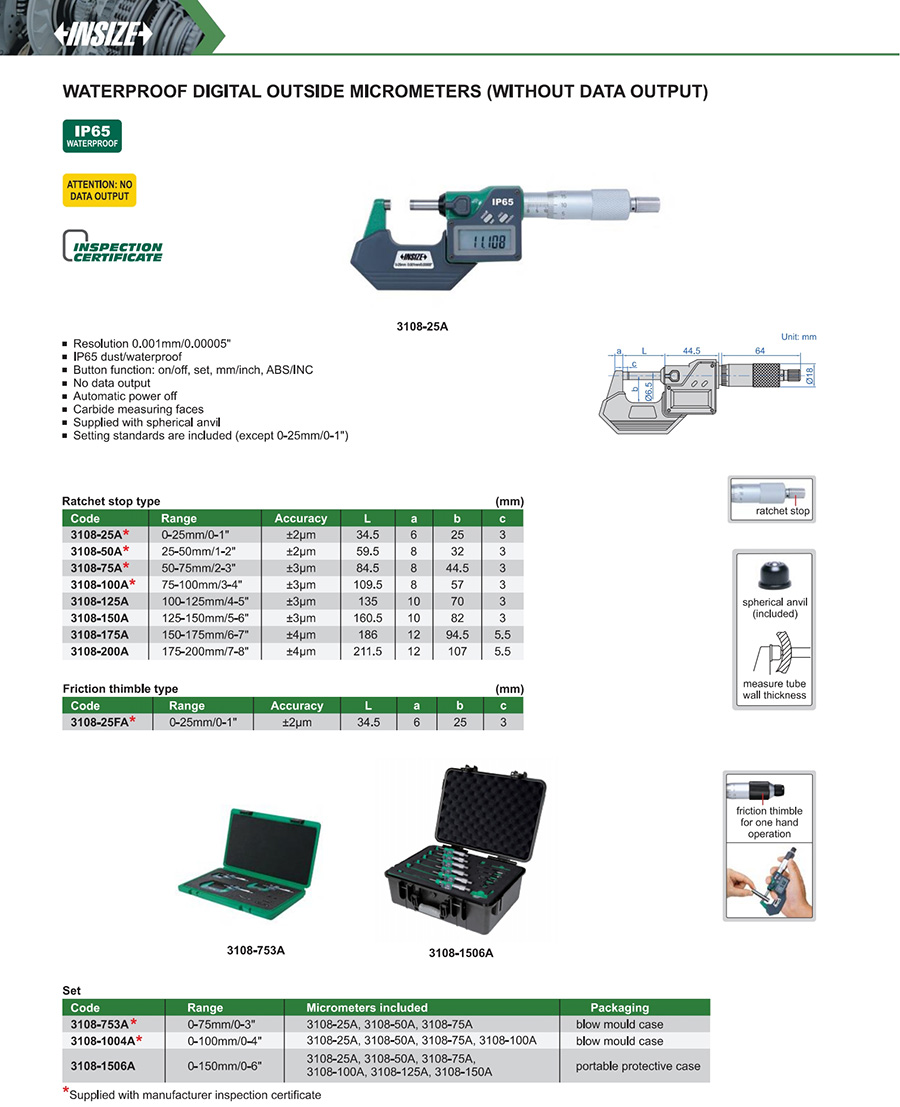 3108-25A ratchet stop 0-25mm/0-1" ±2μm 0.001mm/0.00005"