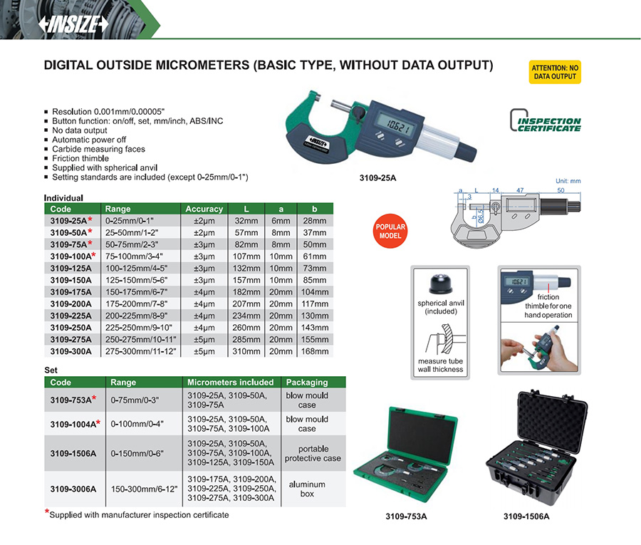| 3109-1506A (Set) | 0-150mm/0-6" | ±2~±3μm | 0.001mm/0.00005" |