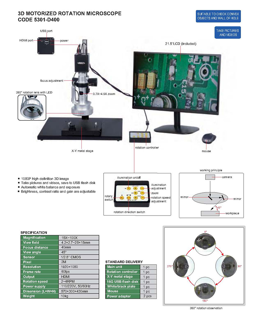 | 5301-D400 | 3D rotation microscopes | 15X~100X | 4.2×2.7mm~28×18mm | 2M |