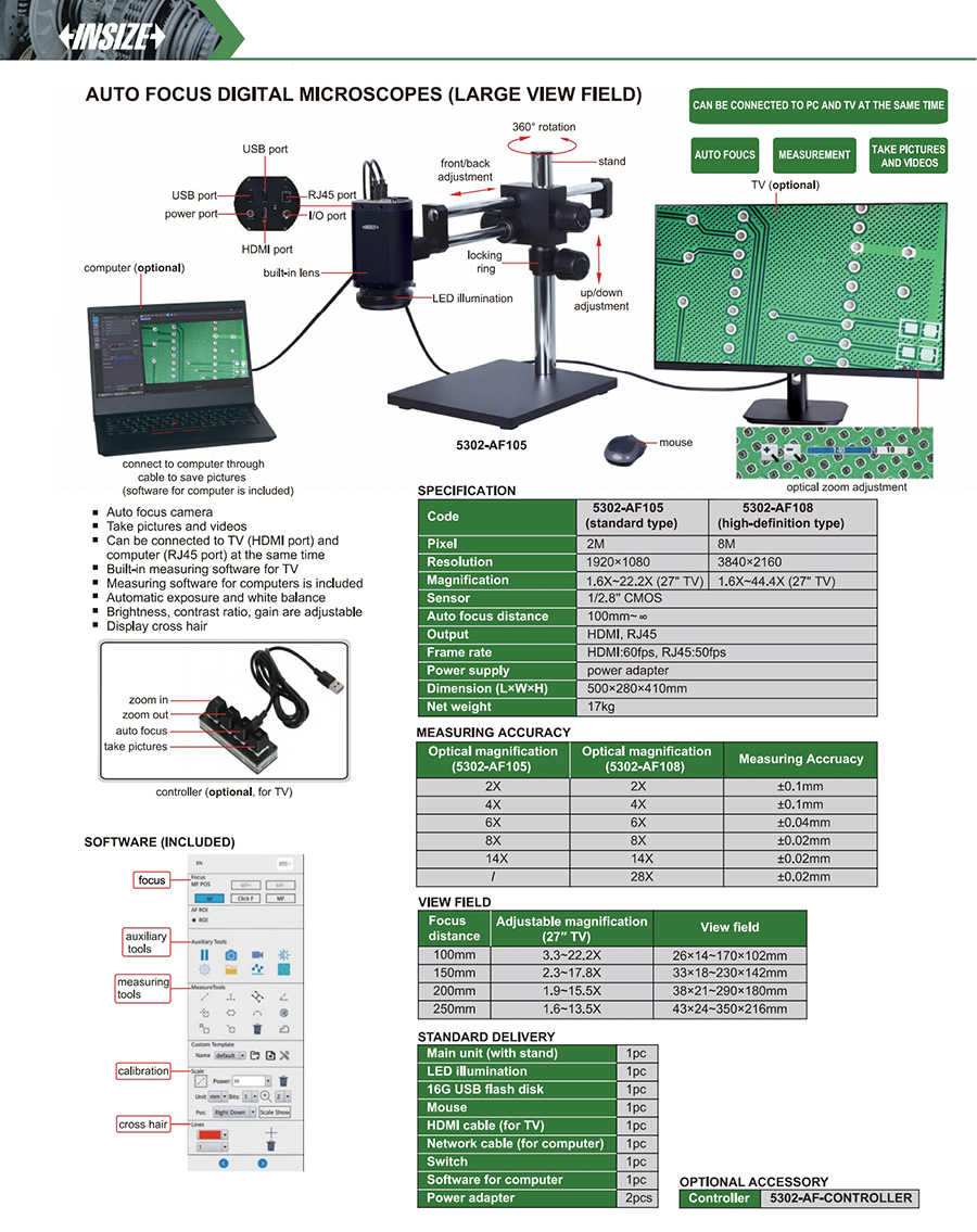 | 5302-AF108 | auto focus digital microscopes | 1.6X~22.2X (27" TV) | 26×14~170×102mm, 33×18~230×142mm, 38×21~290×180mm, 43×24~350×216mm | 8M |