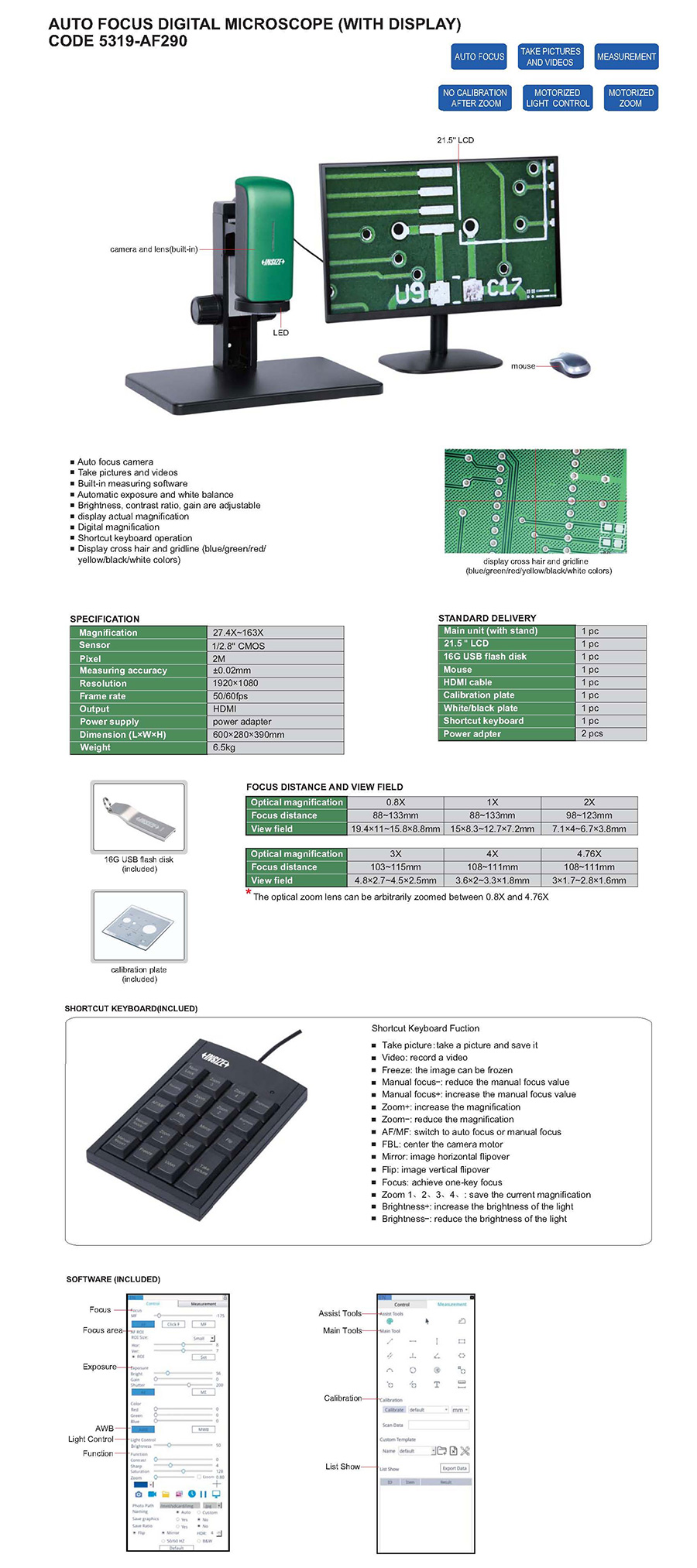 5319-AF290 auto focus digital microscopes 27.4X~163X 19.4×11~15.8×8.8, 15×8.3~12.7×7.2, 7.1×4~6.7×3.8, 4.8×2.7~4.5×2.5, 3.6×2~3.3×1.8, 3×1.7~2.8×1.6 2M