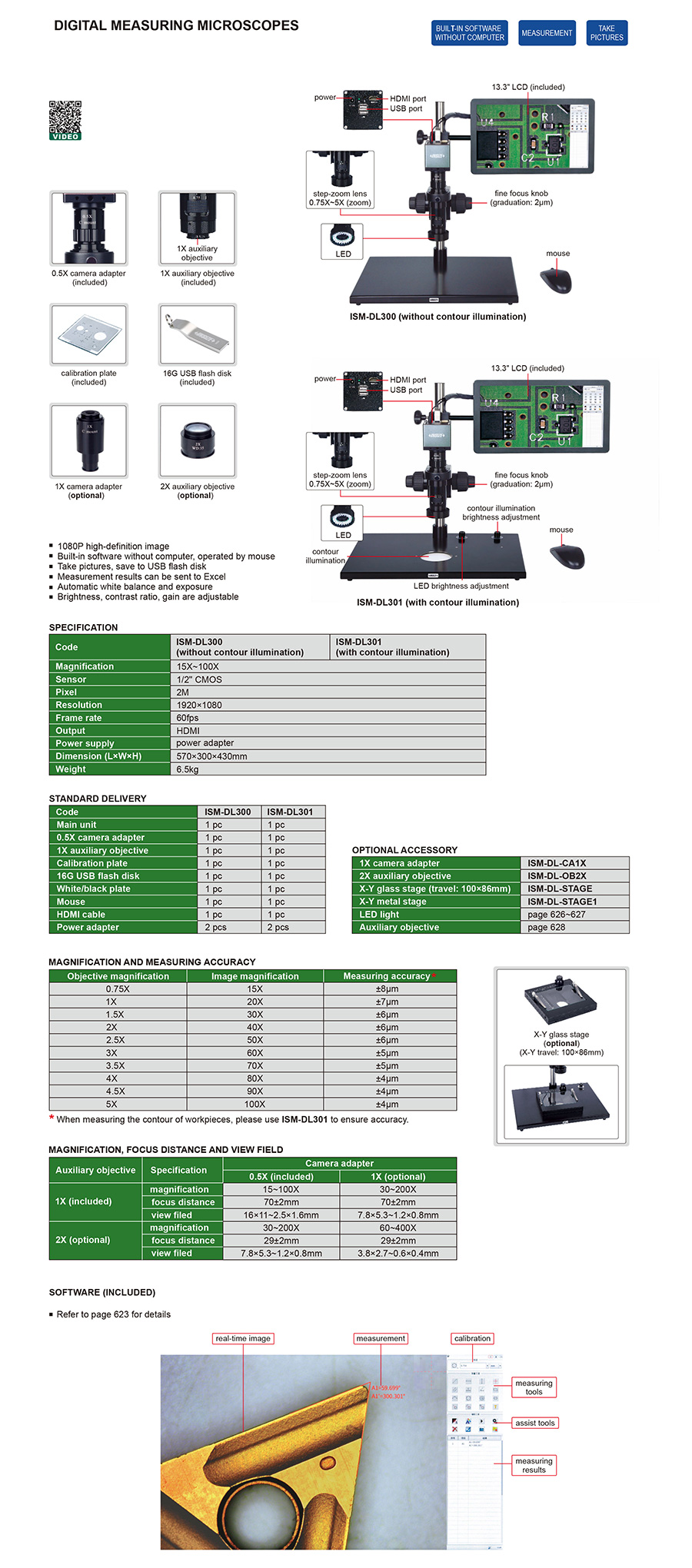 ISM-DL300 digital measuring microscopes 15X~100X 16×11~2.5×1.6mm, 7.8×5.3~1.2×0.8mm 2M