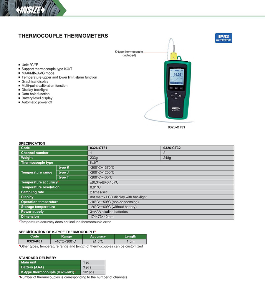 | 0326-CT31 | J | thermocouple | ±(0.3%∙|t|+0.40)°C | 1 | -200°C~1200°C |
