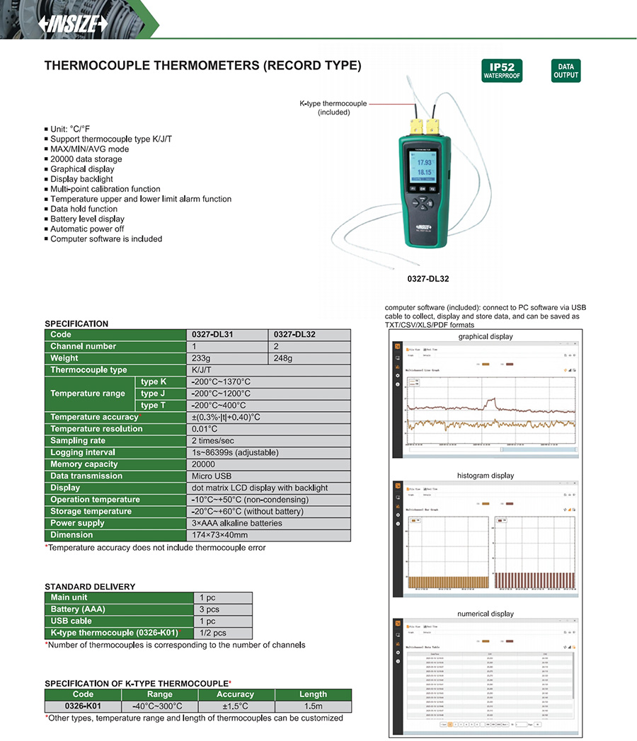 | 0327-DL31 | K | thermocouple | ±(0.3%∙|t|+0.40)°C | 1 | yes | -200°C~1370°C |
