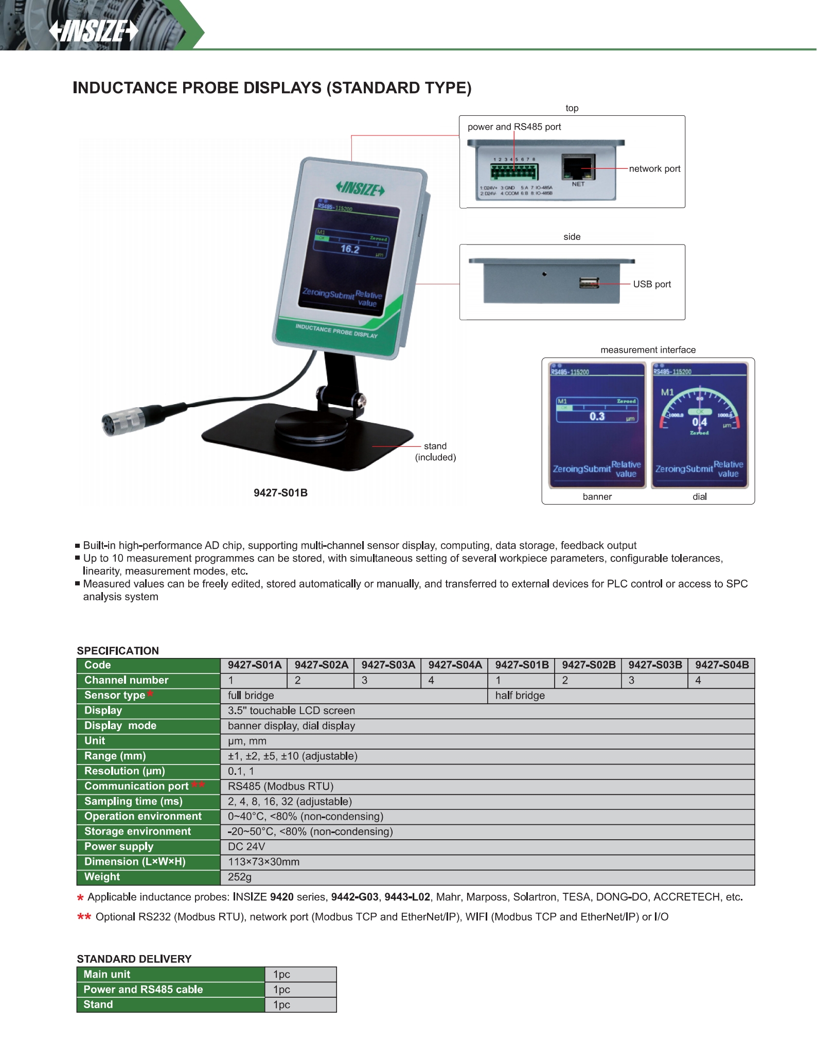9427-S02A inductance probe full bridge ±1, ±2, ±5, ±10mm (adjustable) 0.1, 1µm 2