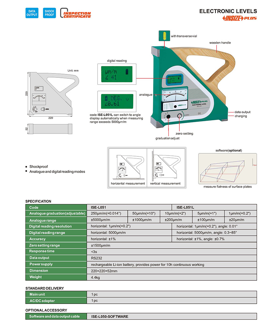 ISE-L051L horizontal: ±1%, angle: ±0.7% horizontal: 1µm/m (=0.2"), angle: 0.01° horizontal: 5000µm/m, angle: 0.3~85°