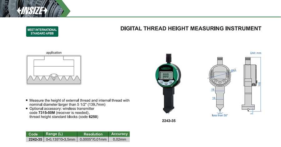 | 2242-35 | 0-0.135"/0-3.5mm | 0.02mm | 0.0005"/0.01mm | thread height |