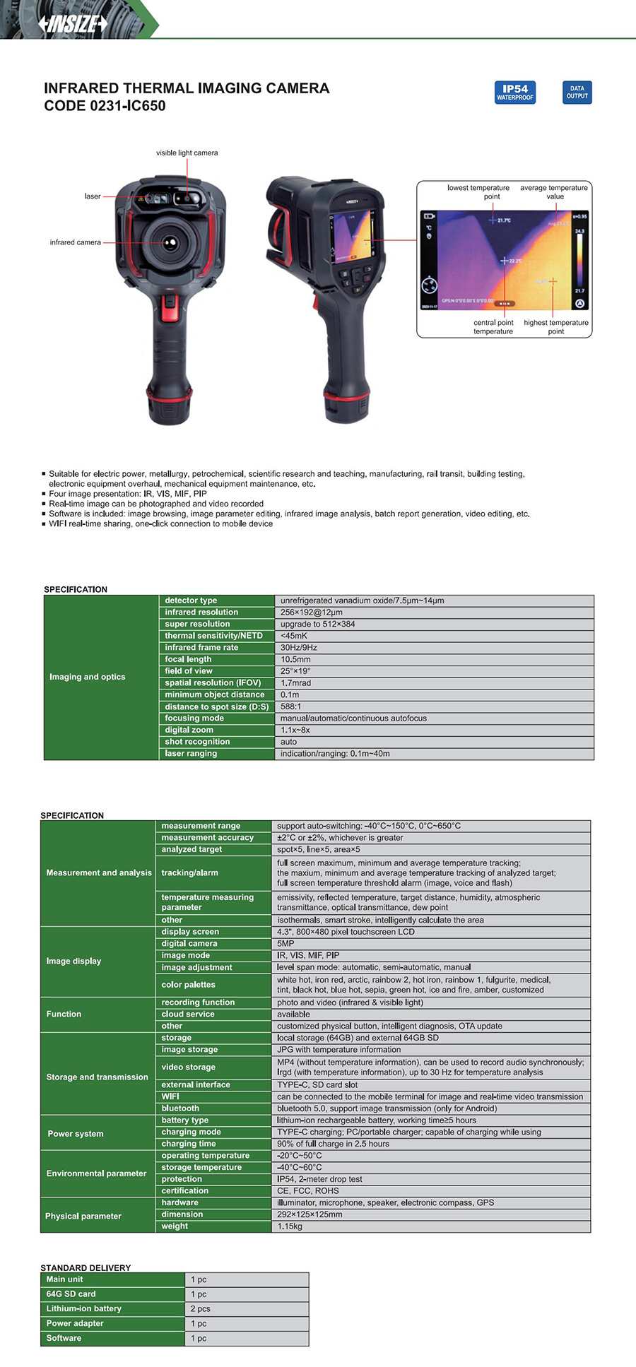 0231-IC650 support auto-switching: -40°C~150°C, 0°C~650°C 256×192@12μm manual/automatic/continuous autofocus yes