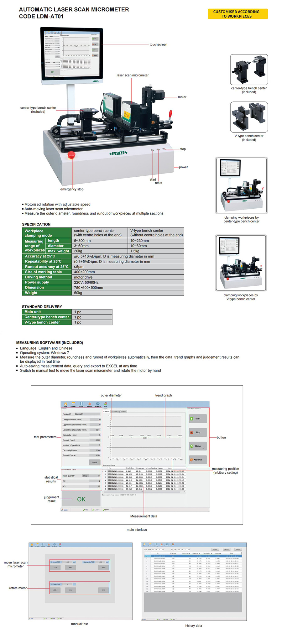 LDM-AT01 workpieces length:5~300mm, 10~230mm/workpieces diameter:3~60mm, 10~60mm/workpieces max. weight:20kg, 1.5kg center-type bench center, V-type bench center