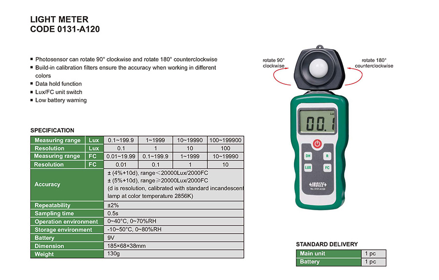 | 0131-A120 | 0.1~199900Lux/0.1~19990FC | 0.1Lux/1Lux/10Lux/100Lux, 0.01FC/0.1FC/1FC/10FC |