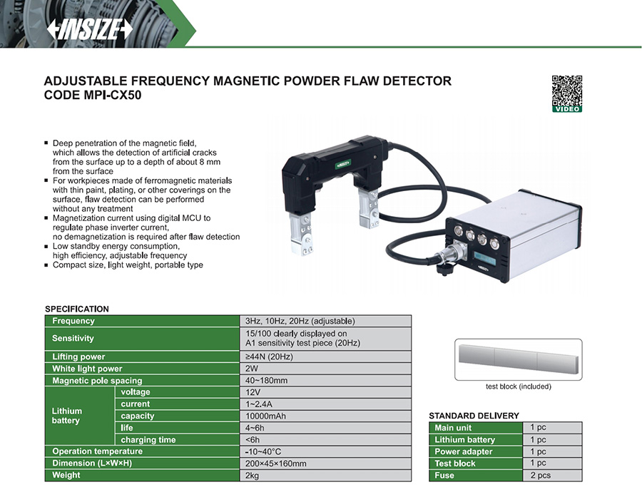 | MPI-CX50 | 15/100 clearly displayed on A1 sensitivity test piece (20Hz) | ≥44N (20Hz) | 40~180mm |