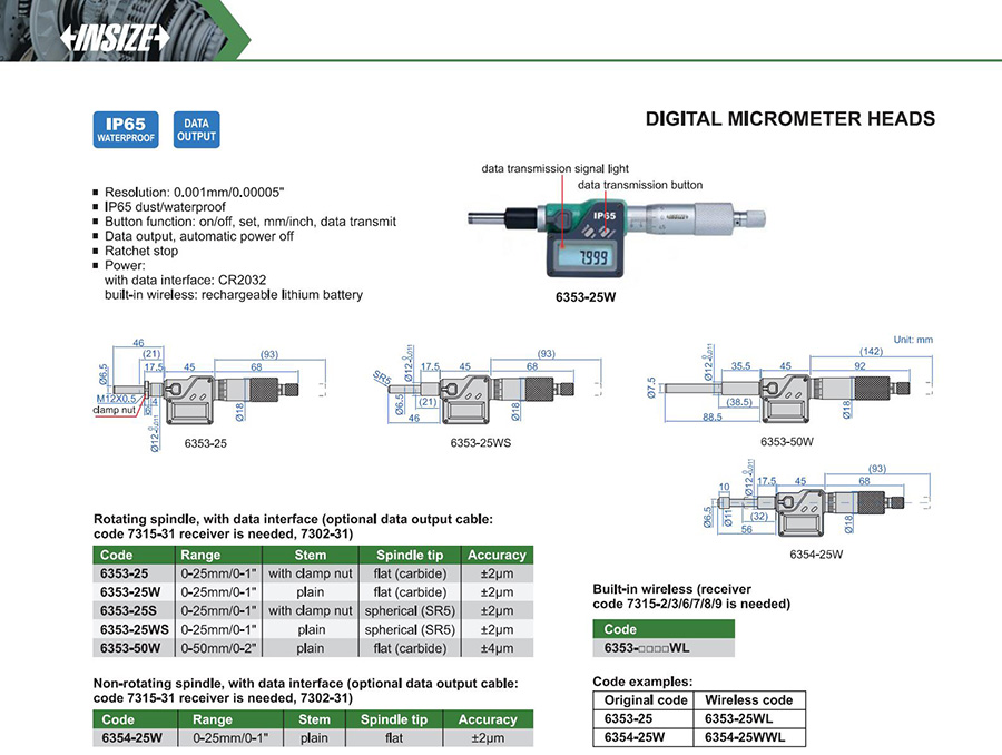 6353-25WS Rotating spindle 0-25mm/0-1" ±2μm 0.001mm/0.00005" plain spherical (SR5)