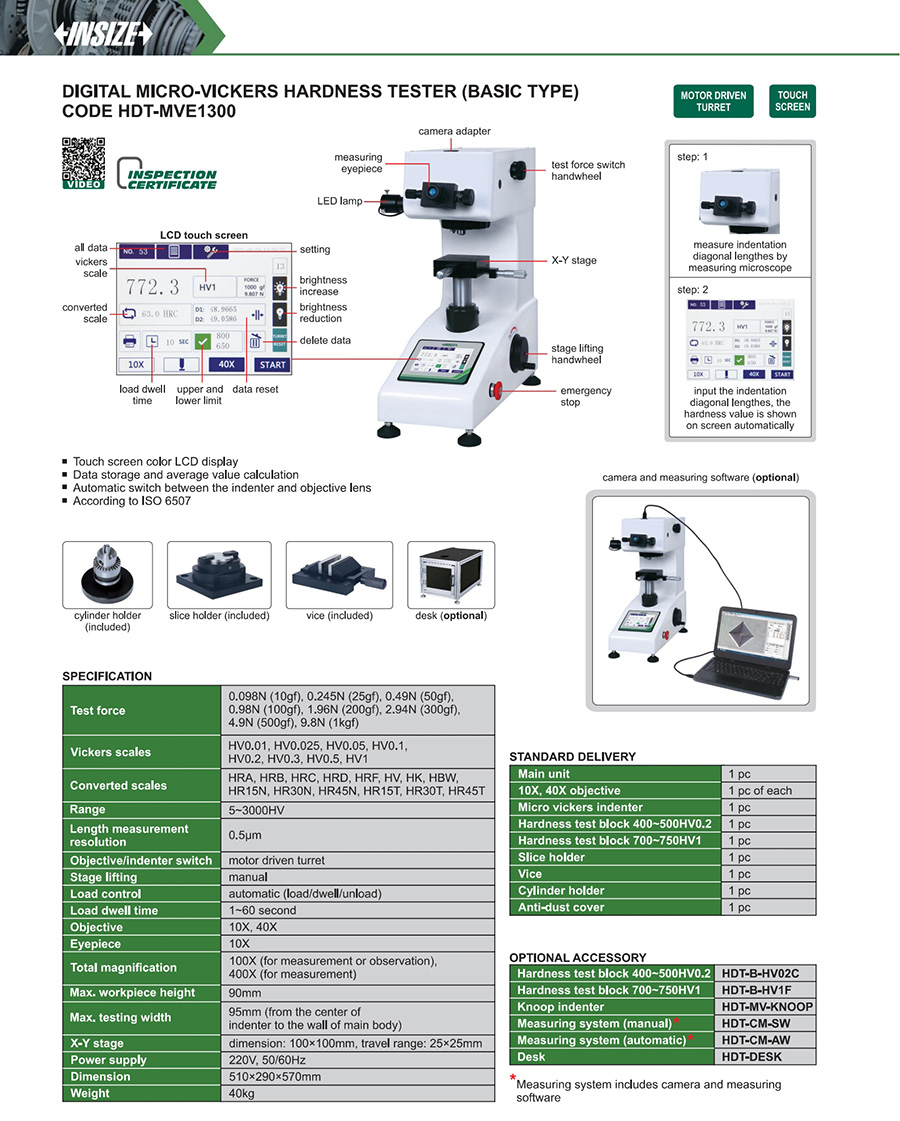 HDT-MVE1300 automatic (load/dwell/unload) 90mm 95mm HV0.01~HV1 100X (for measurement or observation), 400X (for measurement)