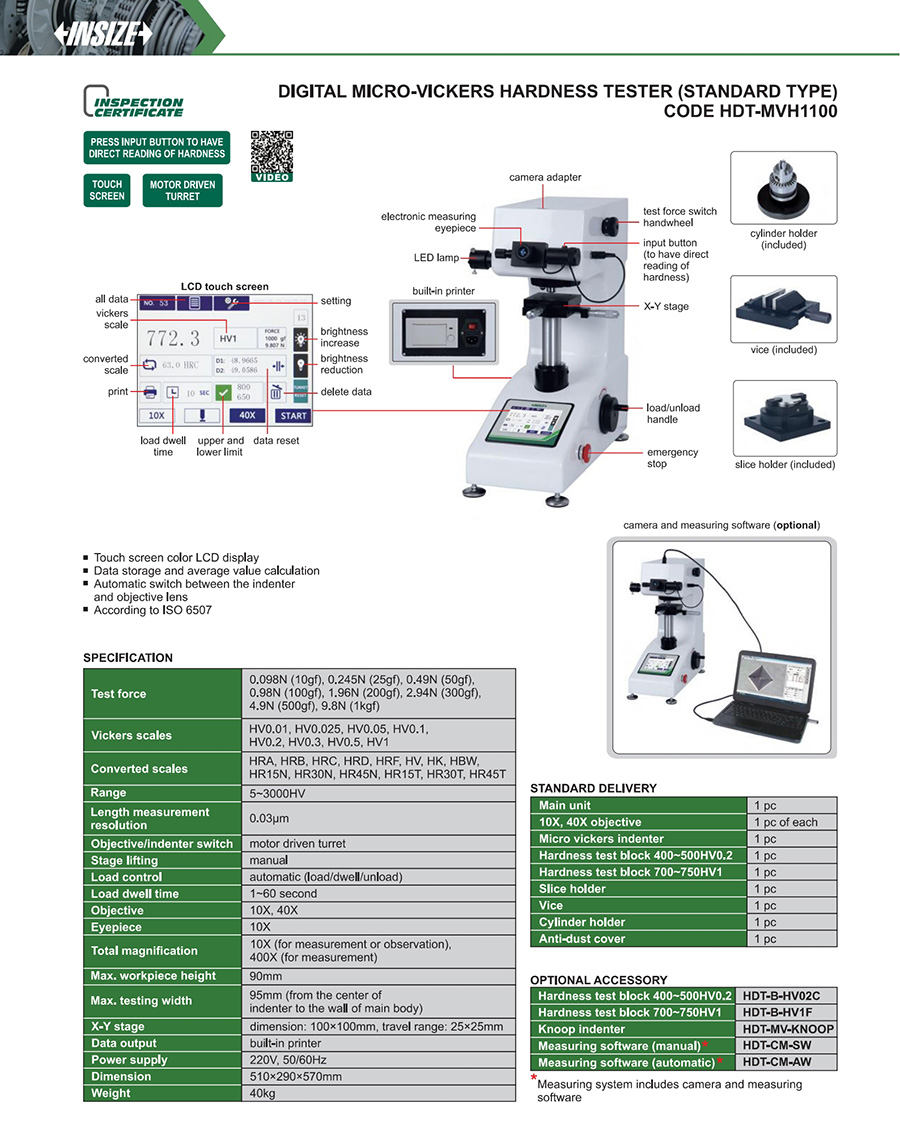 HDT-MVH1100 automatic (load/dwell/unload) 90mm 95mm HV0.01~HV1 10X (for measurement or observation), 400X (for measurement)