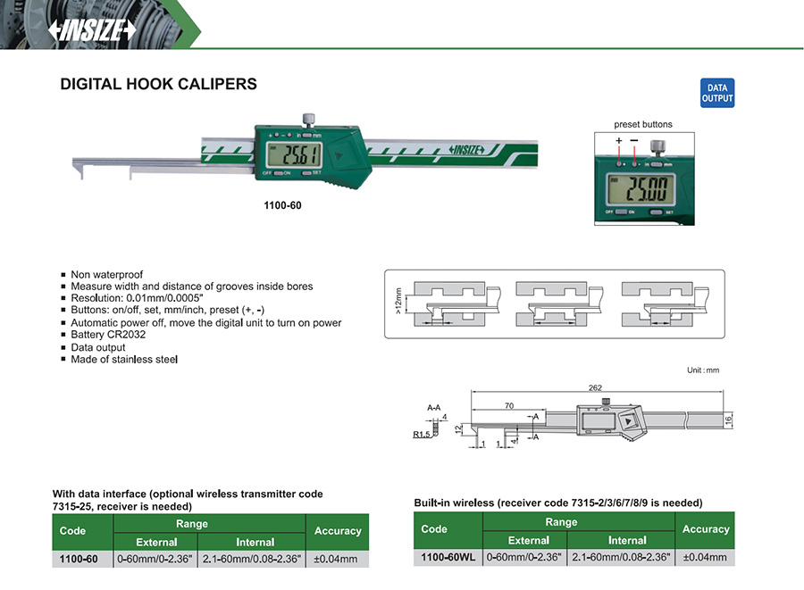 1100-60 external 0-60mm/0-2.36", internal 2.1-60mm/0.08-2.36" ±0.04mm 0.01mm/0.0005" with data interface