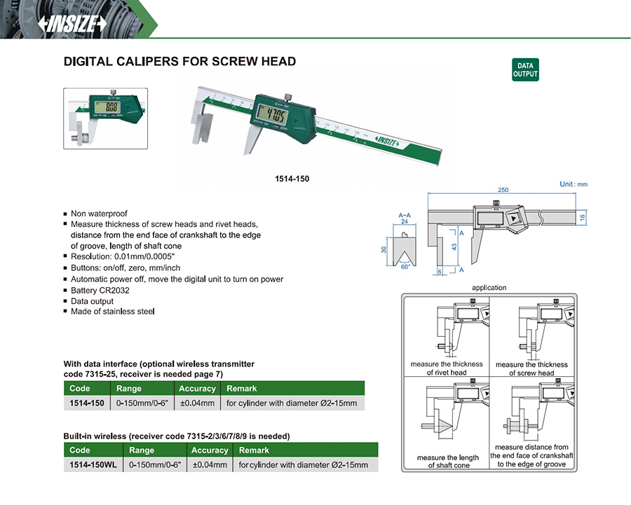 | 1514-150WL | 0-150mm/0-6" | ±0.04mm | 0.01mm/0.0005" |