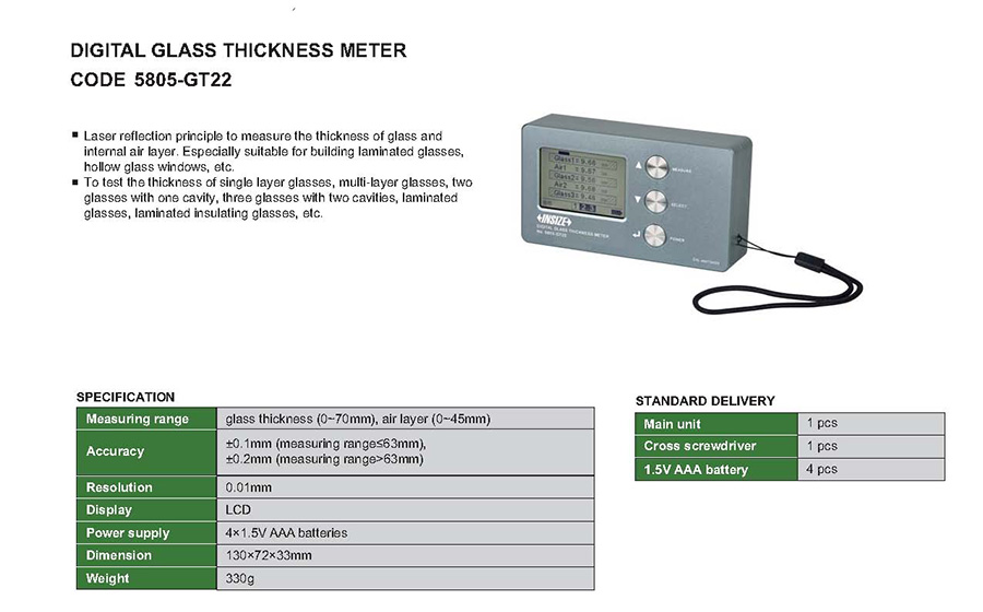 5805-GT22 glass thickness (0~70mm), air layer (0~45mm) ±0.1mm (measuring range≤63mm), ±0.2mm (measuring range>63mm)