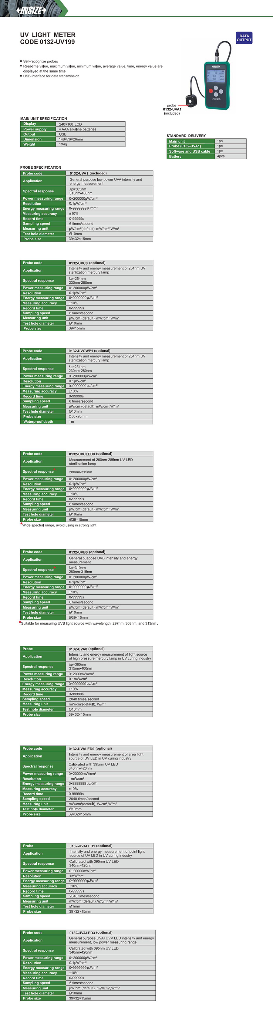 0132-UVA199 general purpose low power UVA intensity and energy measurement Power:0~200000µW/cm² Test hole:Ø10mm Probe:39×32×15mm