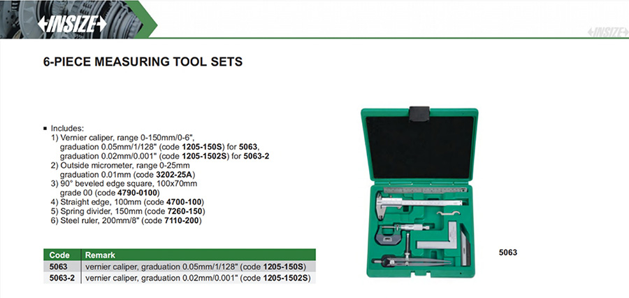 Vernier caliper, range 0-150mm/0-6", graduation 0.05mm/1/128" (code 1205-150S) for 5063, graduation 0.02mm/0.001" (code 1205-1502S) for 5063-2