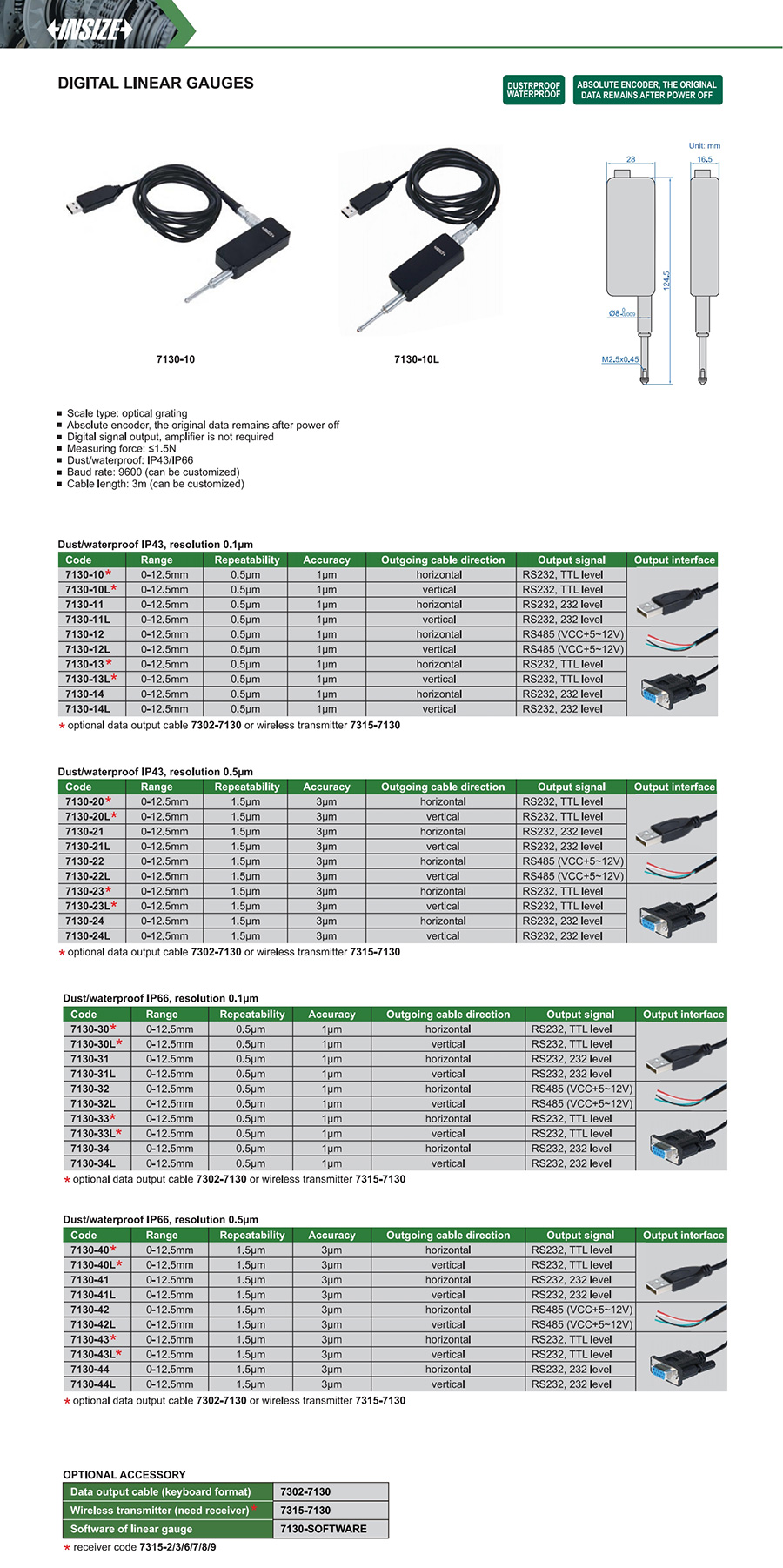 7130-31 optical grating 0-12.5mm 1µm RS232, 232 level horizontal