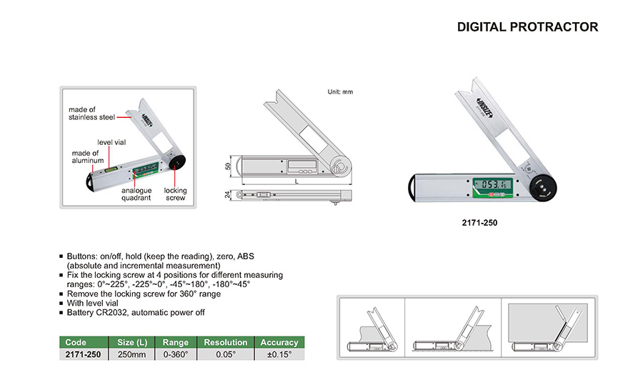 Fix the locking screw at 4 positions for different measuring ranges: 0°~225°, -225°~0°, -45°~180°, -180°~45°