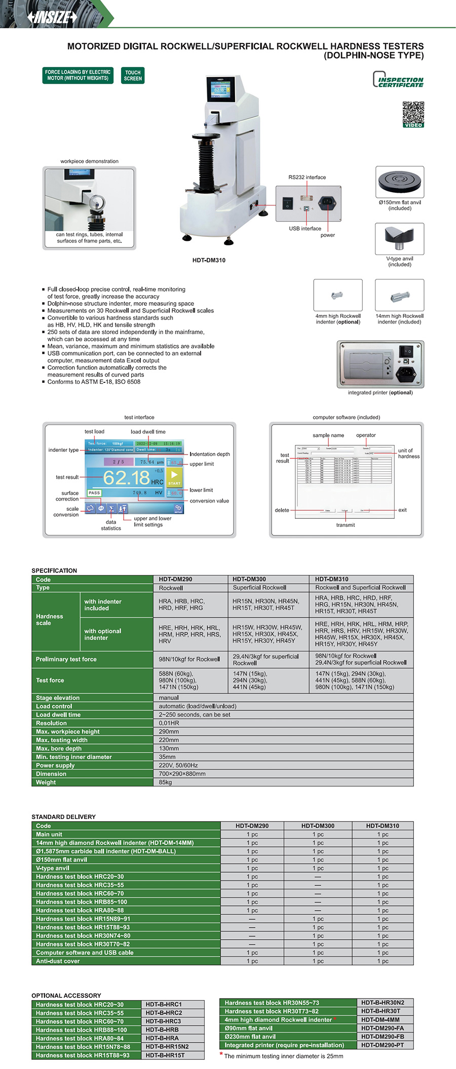 HDT-DM310 0.01HR automatic (load/dwell/unload) 290mm 220mm HRA, HRB, HRC, HRD, HRF, HRG, HR15N, HR30N, HR45N, HR15T, HR30T, HR45T