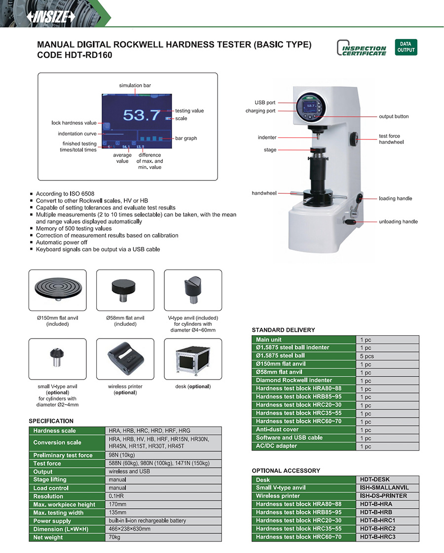 Code Resolution Load control Max. workpiece height Max. testing width Hardness scale