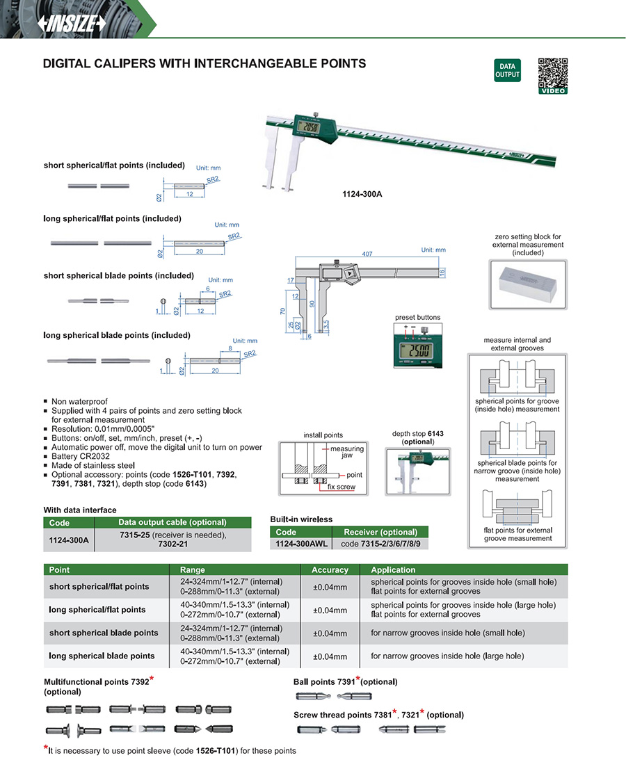 | 1124-300A | 40-340mm (internal), 0-272mm (external) | ±0.04mm | 0.01mm/0.0005" | with data interface | long spherical blade points |