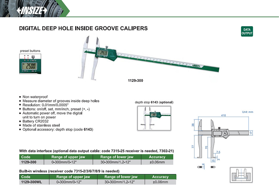 1129-300 0-300mm/0-12" 30-300mm/1.2-12" ±0.06mm 0.01mm/0.0005" with data interface