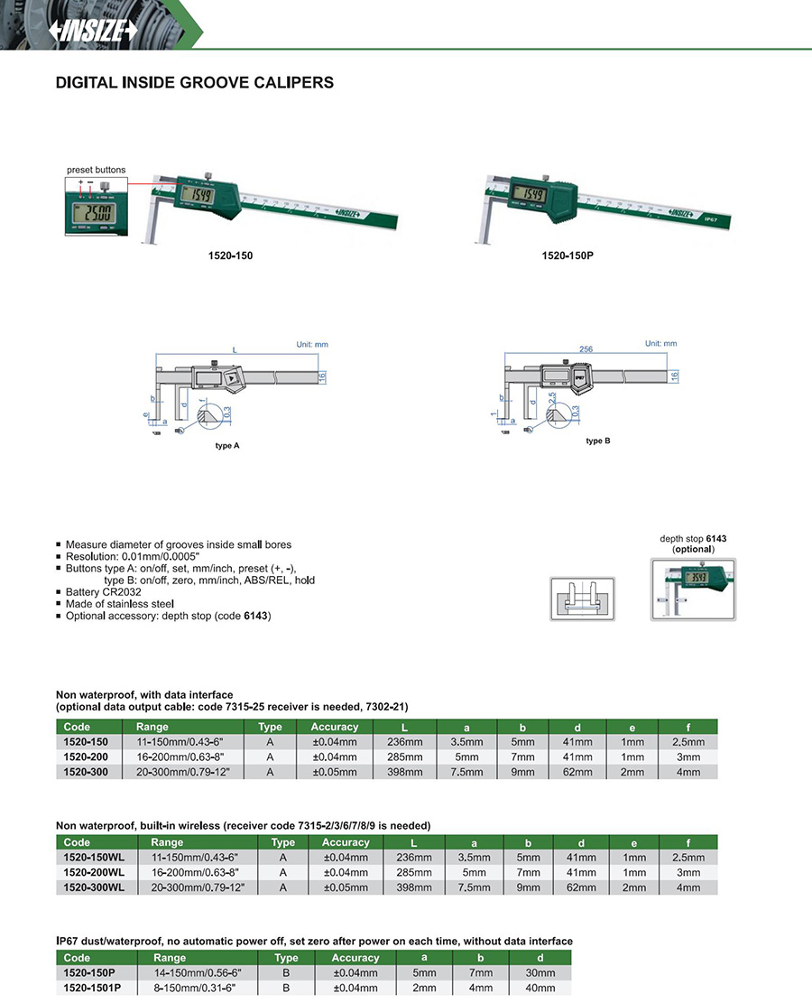 1520-150WL A 11-150mm/0.43-6" ±0.04mm 0.01mm/0.0005" built-in wireless