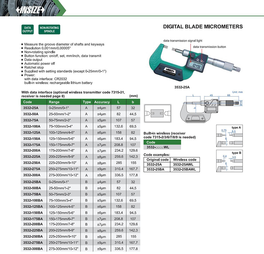 | 3532-25AWL | A | 0-25mm/0-1" | ±4μm | 0.001mm/0.00005" | built-in wireless |