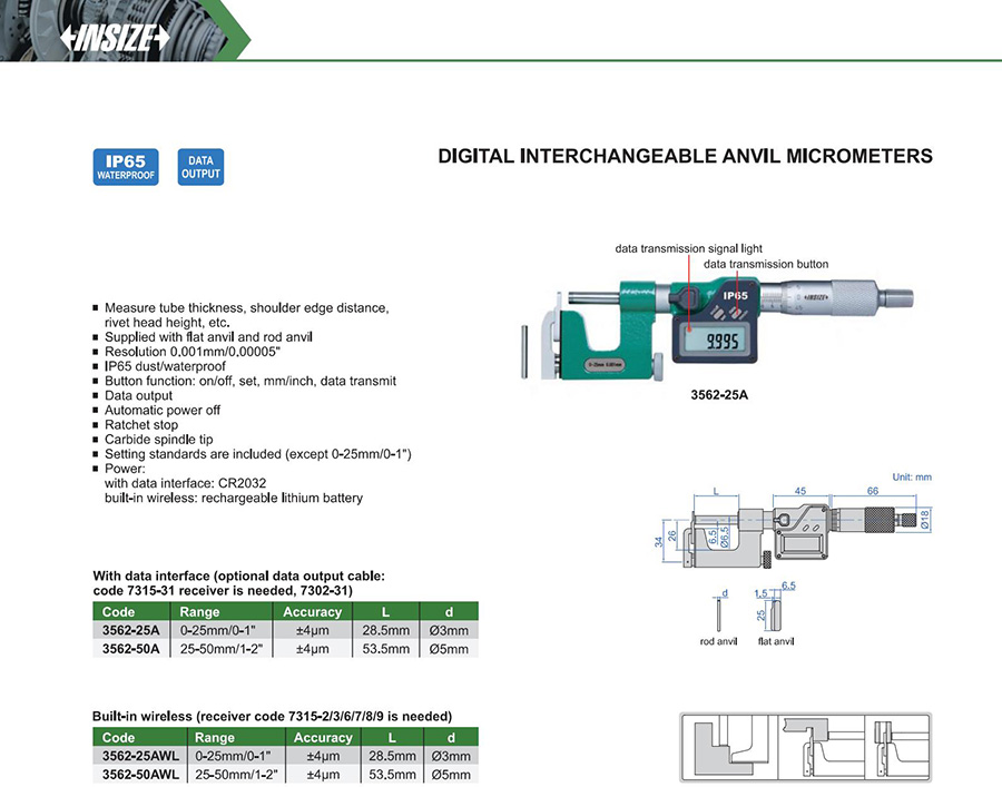 | 3562-50A | 25-50mm/1-2" | ±4μm | 0.001mm/0.00005" | with data interface |