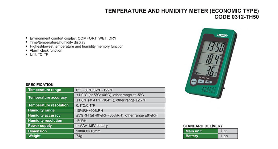 | 0312-TH50 | digital | internal | ±1.0°С (at 5°С~40°С), other range ±1.5°С±1.8°F (at 41°F~104°F), other range ±2.7°F | 10%RH~90%RH | ±5%RH (at 40%RH~80%RH), other range ±8%RH | 0°C~50°C/32°F~122°F |