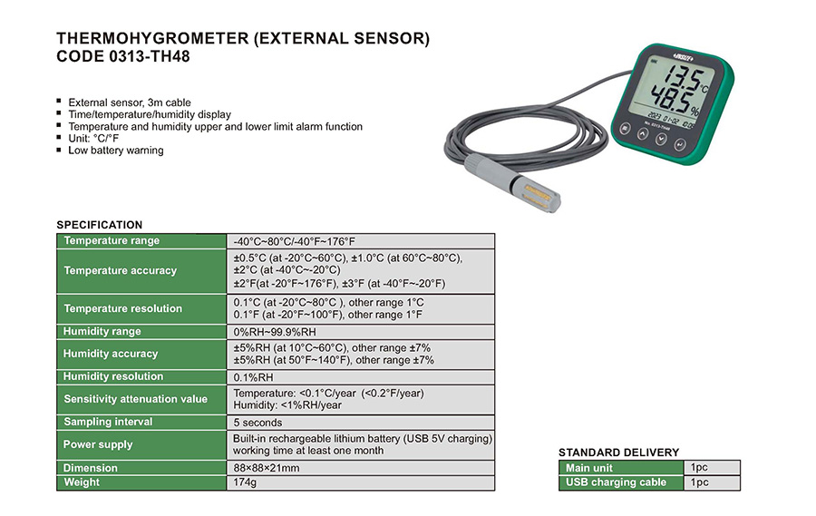 | 0313-TH48 | digital | external | ±0.5°С (at -20°С~60°С), ±1.0°С (at 60°С~80°С), ±2°С (at -40°С~-20°С)/ ±2°F(at -20°F~176°F), ±3°F (at -40°F~-20°F) | 0%RH~99.9%RH | ±5%RH (at 10°С~60°С), other range ±7%/ ±5%RH (at 50°F~140°F), other range ±7% | yes | -40°С~80°С/-40°F~176°F |